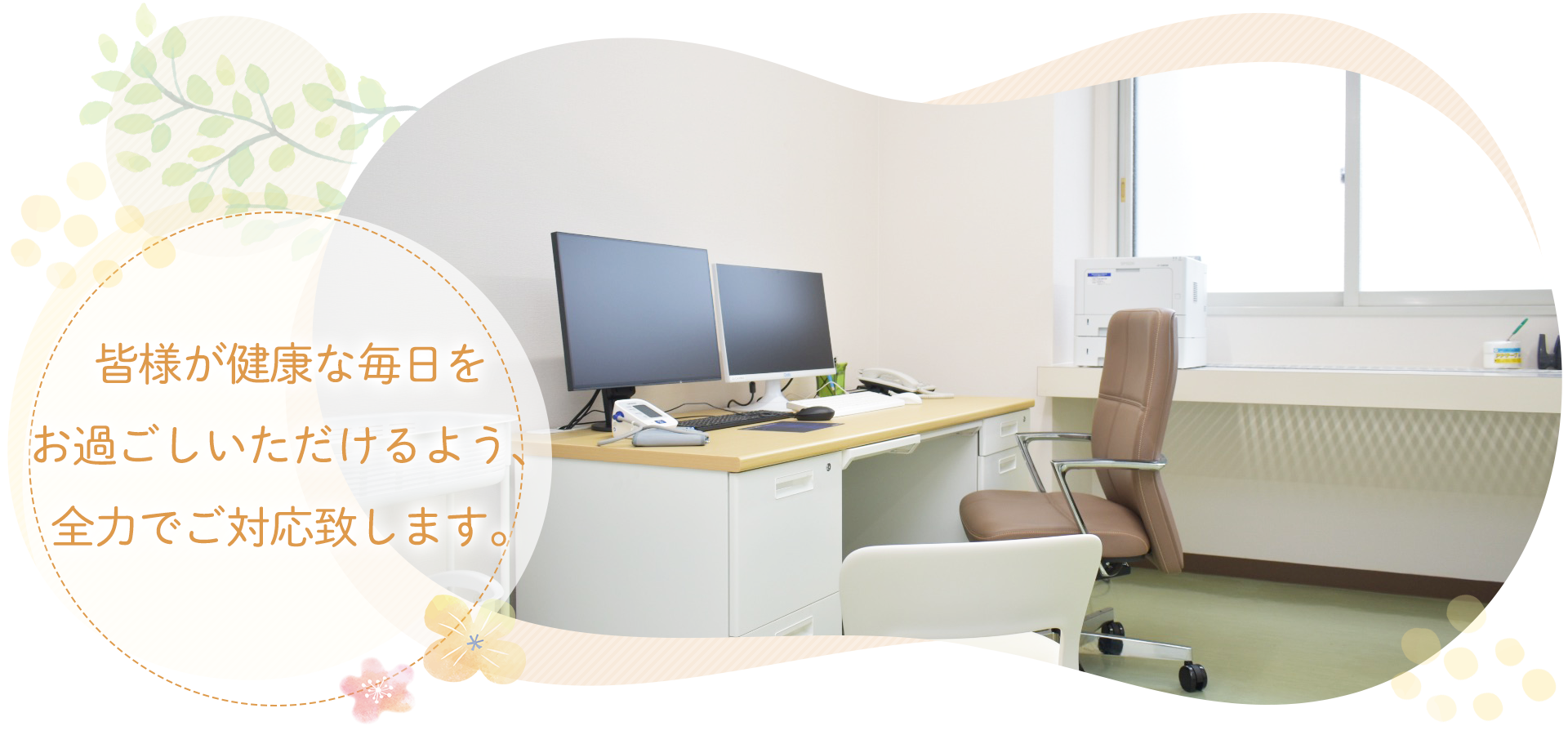私たちは、『地域の皆さまに信頼されるかかりつけ医』を目指しております。そのために患者さんお一人お一人の健康上の悩みや不安に真摯に向き合い、ご納得・ご理解いただいたうえで治療を受けていただけるよう、わかりやすく丁寧な説明を心がけております。